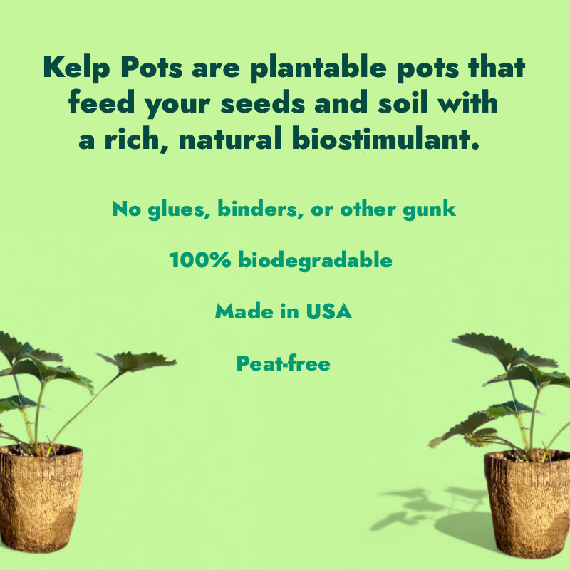 Our Kelp Pots are designed to make gardening easier, greener, and more rewarding. Made from sustainably harvested seaweed and recycled natural fibers, these biodegradable seed-starters enrich your soil, reduce transplant shock, and naturally decompose, leaving nothing but healthy plants and happy gardens behind.